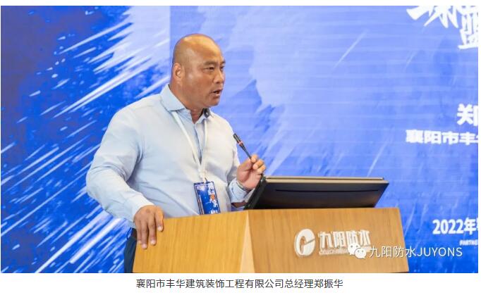 接着,襄阳市丰华建筑装饰工程有限公司总经理郑振华讲述了自己作为九阳合作伙伴一路走来的点点滴滴,并感谢九阳长期以来的支持及帮助,郑总表示通过此次会议,他看到了九阳近些年来的高速发展,对与九阳的合作充满信心。同时也期待九阳在防水行业有更大的作为,为行业做出更大的贡献。