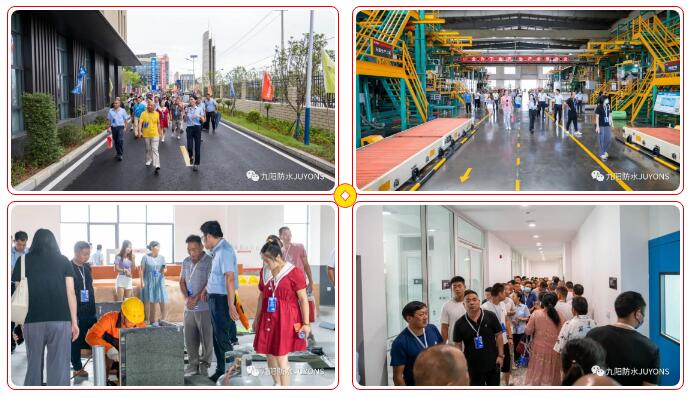 会议结束后,出席会议的各位领导及全体合作伙伴观摩了九阳防水峪山生产基地,依次参观了研发大楼、施工实训基地、屋面耐老化测试场地、数字化生产车间、展厅等区域,了解基地发展状况以及生产经营情况。