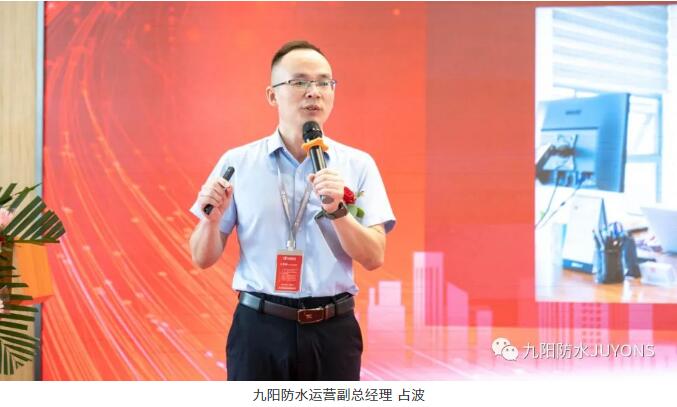 九阳防水运营副总经理占波从企业品牌、基地布局、研发实力、技术优势、战略合作等方面介绍了公司的发展历程及战略规划。他表示,此次战略合作,九阳防水将依托五大生产制造基地,6大营销服务中心,20多个驻外办事处和上百家经销代理服务网点,省内最大的施工实训基地,高分子重点实验室,近百件的专利技术及服务优势,联合坚朗公司覆盖全国的销售服务网络及客户资源优势,在深度与广度上拓展营销服务新思路,打造“专业、优质、高效”的防水服务生态,共同实现以高品质建造美好人居生活的承诺。