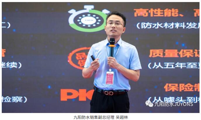 随后,九阳防水销售副总经理吴超林作“臻橙堡”全筑高分子产品演讲,针对当前国家提出的“双碳”目标和国家大力推行新材料的行业背景下,围绕“臻橙堡”全筑高分子系列4款产品,从产品的优异性能、耐用耐候的施工应用优势、绿色环保的经济效益等方面展示九阳防水将以绿色环保、高品质产品与高质量服务,为广大客户创造价值,实现与长期同行者共创共享。