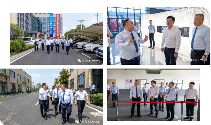 期间,坚朗公司总裁白宝鲲、副总裁张德凯及公司高管等领导一行参观了九阳防水峪山生产基地,对基地的研发大楼、施工实训基地、屋面耐老化测试场地、数字化生产车间、展厅等进行了观摩。