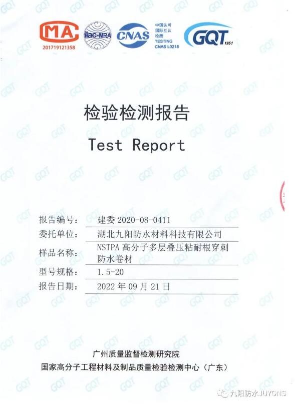 近日,九阳防水NSTPA高分子多层叠压粘耐根穿刺防水卷材顺利通过国家高分子工程材料及制品质量监督检测中心(广东)的耐根穿刺性能检验,这成为了九阳高分子类产品升级发展中又一个重要的里程碑。