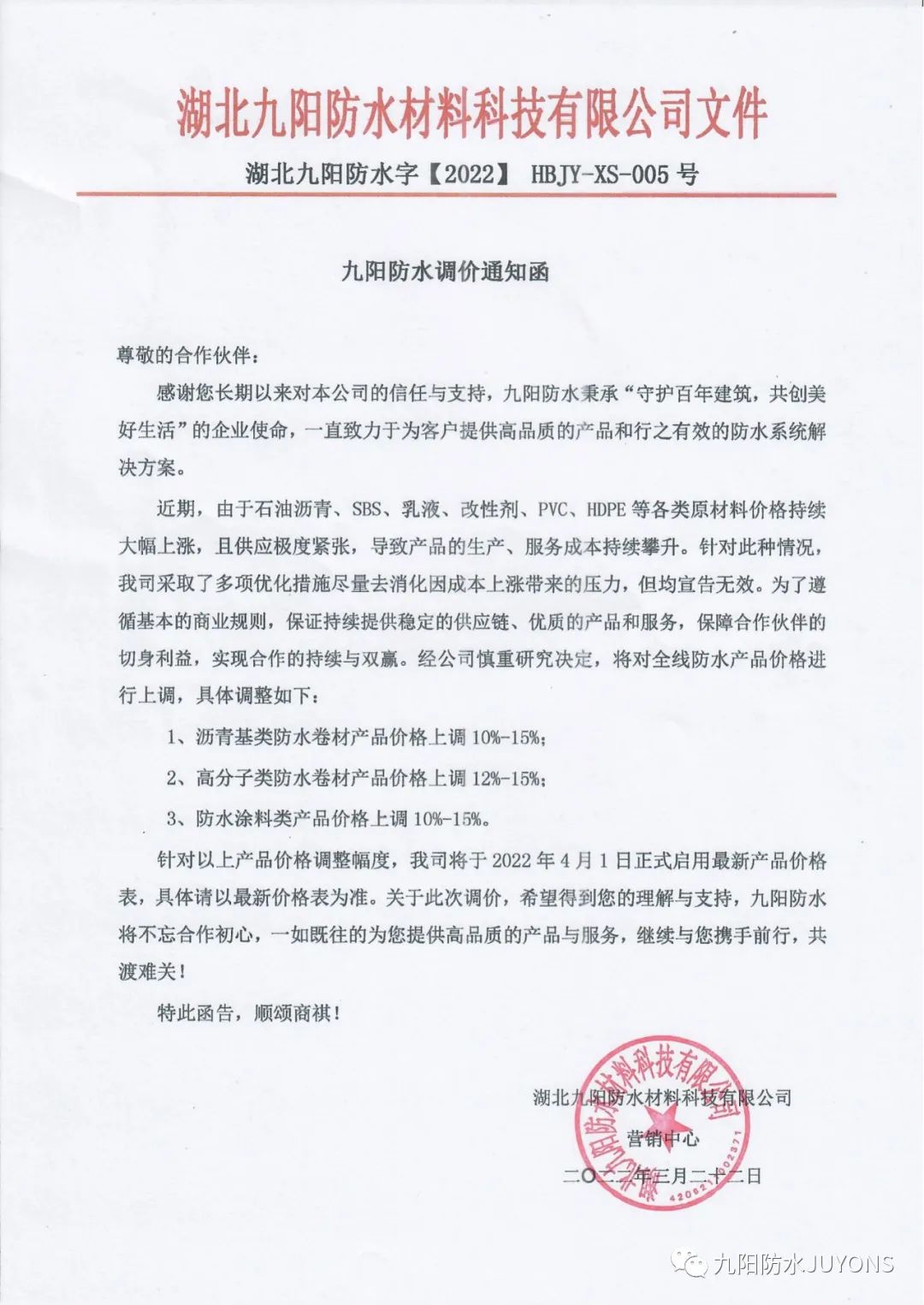 在当前主要原材料价格持续走高,成本普遍上涨的背景下,为响应中国建筑防水协会《关于工程防水材料质量风险提示函》文件中提到的“必须警惕低于国标、行标的非标产品死灰复燃的质量风险,坚决遏制建筑渗漏通病”的文件精神,持续践行九阳防水“守护百年建筑,共创美好生活”的企业使命,守住企业社会价值底线、产品品质和服务质量,九阳防水针对公司产品作出如下调价举措。