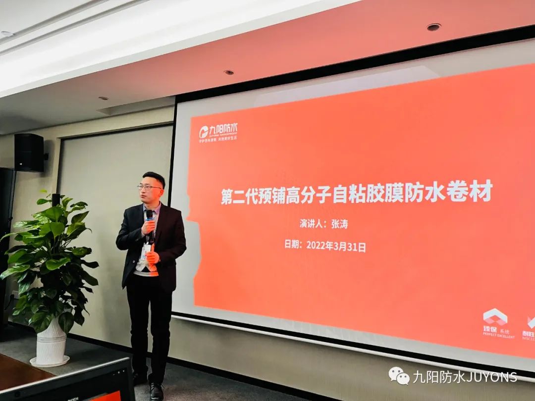 接下来,九阳防水研发中心总监张涛以专业的视角为与会人员们打开了防水产品技术新思路,对九阳第二代预铺高分子自粘胶膜防水卷材产品进行了详细介绍,围绕预铺反粘技术、预铺卷材的基本要求及九阳第二代预铺高分子自粘胶膜防水卷材的关键技术进行了阐述讲解。