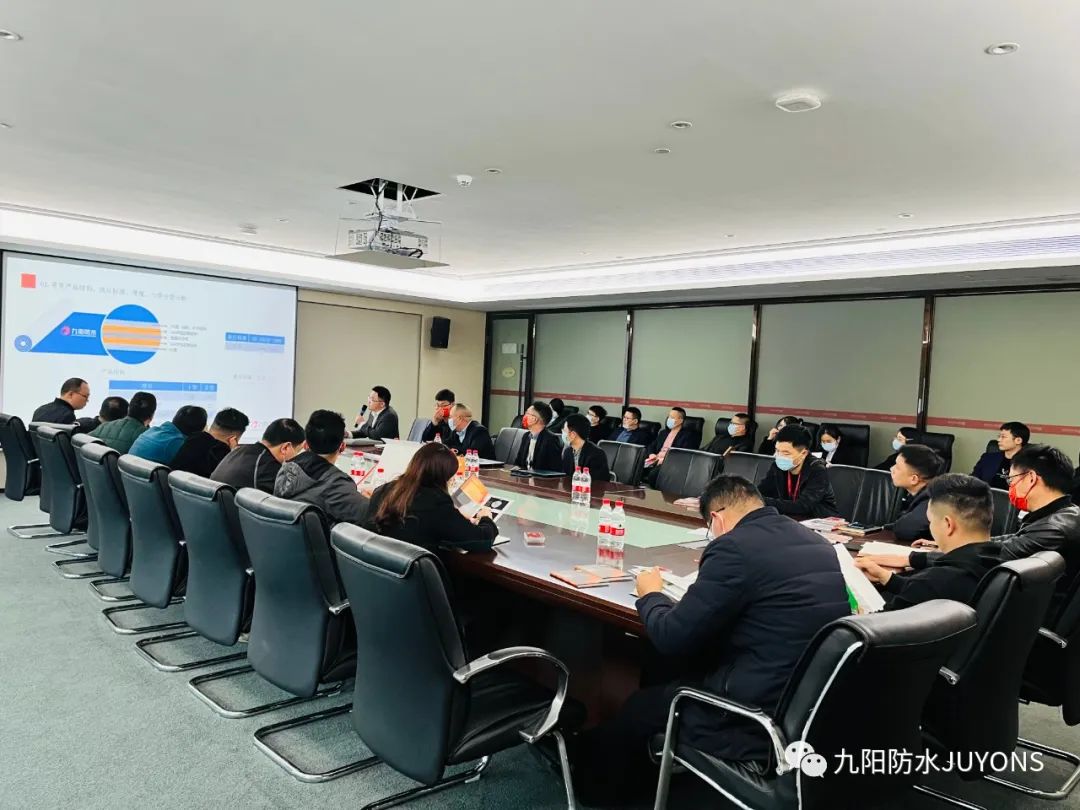 会议开始,九阳防水运营经理王秀简单介绍了公司的发展历程,九阳防水坚持“客户为先,奋斗为本,协作创新”企业核心价值观,20年来不断精进产品系统与服务标准,现已建立起以高质量防水产品为核心,搭建具有产业价值链、整合协同优势的发展架构,成为省内首个民营建筑防水全生态产业链企业,致力于为美好建筑工程保驾护航!