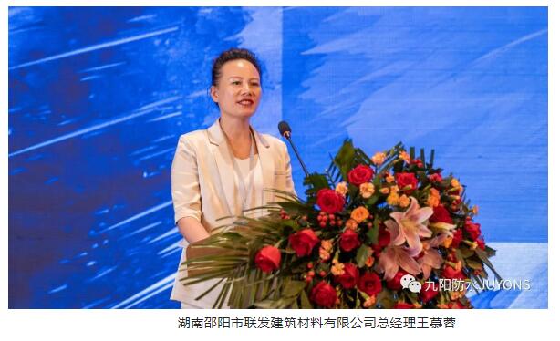 随后,湖南邵阳市联发建筑材料有限公司总经理王慕蓉进行客户代表发言。她表示,邵阳联发的防水市场开拓及发展得益于九阳公司的支撑,这些年,在九阳公司的营销支持和我们联发团队人员的共同努力下,我们取得了一定成绩,我非常感谢九阳为我们提供高品质的产品和专业的技术服务,未来,我们期待与九阳继续保持长期的、良好的、更加紧密的合作关系,不断促进彼此之间业务合作,共同获得长足持久的发展。