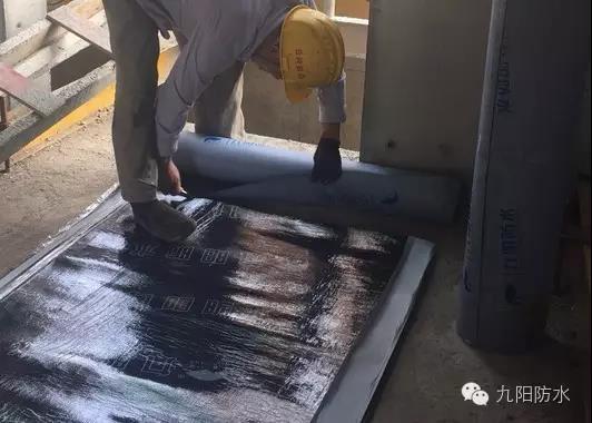 5)粘贴大面卷材时,不要将卷材背面搭接部位的透明隔离膜过早揭掉,以免污染粘结层或误粘。如卷材需要粘结的HDPE膜面有污染,可用专用基层处理剂清洗